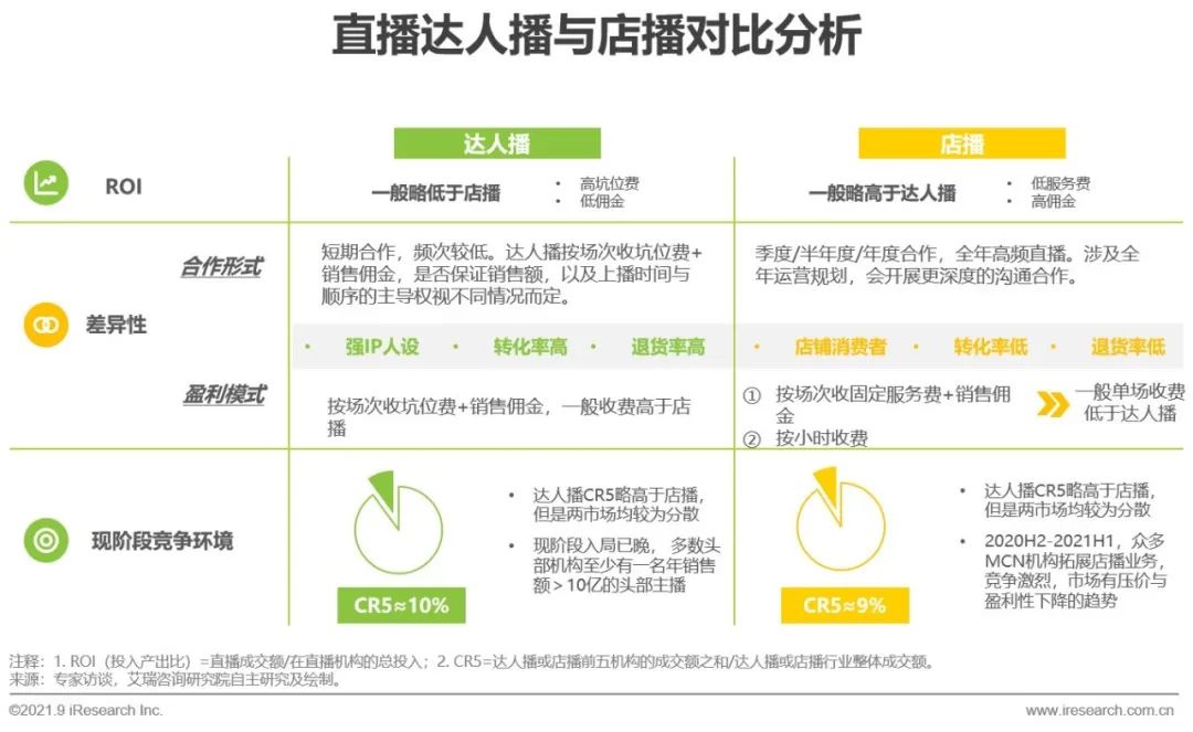 達(dá)人播具有強烈的IP屬性,以主播為中心進行混播,商家與主播按單場合作,而店播模式下,商家與店播代運營機構(gòu)是長期合作,以店鋪賬號為主全年進行常態(tài)化直播。店播為了長期合作,以傭金為主要收費,其ROI一般略高于達(dá)人播。同時由于受眾不同,達(dá)人播主播帶有強烈的IP屬性,因此轉(zhuǎn)化率與退貨率均高于店播。