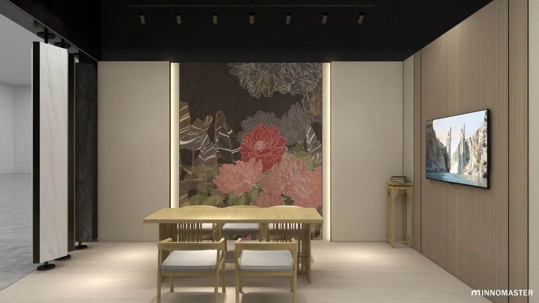 現(xiàn)代風(fēng)情的紋理,那么輕柔,那么淡雅。中間疊加國色天香墻板,繁華絢爛中覓得寧靜悠長,情景交融,虛實(shí)相生,營造閑來知茶的清幽境界。