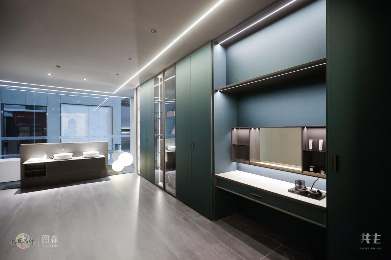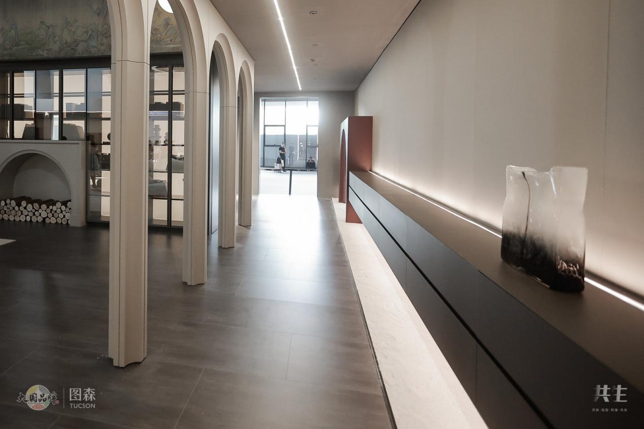 通過展館人員講解,我們了解到:圖森本次是以“共生”為主題打造了此間展館,整個空間詮釋融合共生,共生共榮,中西方文化交流,藝術與美學碰撞,傳承經典、綻放當代。整個展館在意、形、神上達到和諧共生,重塑家居空間,融入自然。展館的靈感源于中國十大傳世名畫之一《千里江山圖》,表達了人與自然和諧共生的理想狀態。江山無限,心中丘壑層疊,好山好水下,黎民安樂其間,亦為大國所愿。當下人們在城市中,追求與自然的平衡關系,與自然共生,圖森秉著對未來理想城市的共創、共處,應用開放的設計理念與包容的產品體系,打造此間展館。