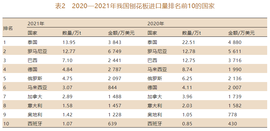 按進口量統計,如表2所示,2021年我國從泰國、羅馬尼亞、巴西、德國、俄羅斯5國進口的刨花板數量為43.41萬t,占我國刨花板進口總量的59.2%;從泰國進口的刨花板數量為13.95萬t,占我國刨花板進口總量的19.0%,穩居第1;從羅馬尼亞和巴西進口的刨花板數量分別為12.77萬t和7.10萬t,占進口總量的17.4%和9.7%,列居第2、3位。