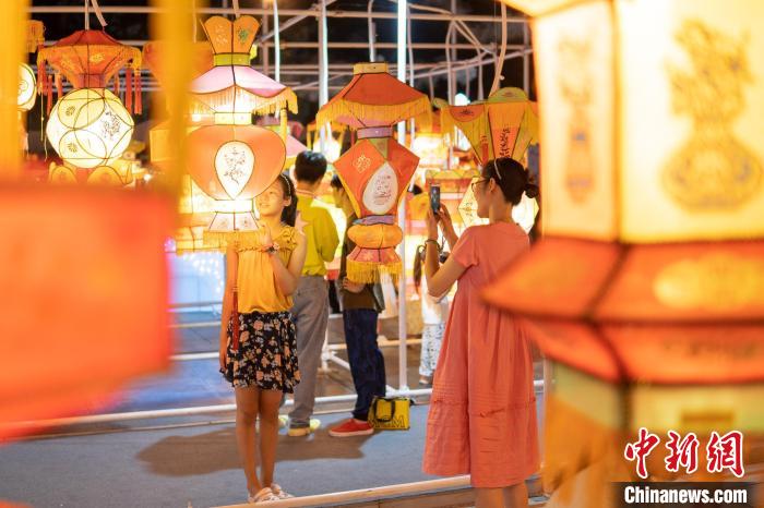 2023中國(guó)傳統(tǒng)工藝振興主題展18日晚在北京中華世紀(jì)壇南廣場(chǎng)開幕,圖為民眾在展出的花燈前拍照。中新社記者 趙明 攝