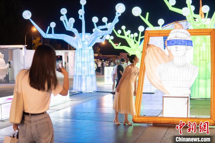 在中華世紀(jì)壇廣場(chǎng)代表五千年文明史的青銅甬道上,四川自貢“一朵花兒的民藝復(fù)興”、福建泉州“大尾燈龍”等主題的傳統(tǒng)彩燈工藝裝置吸引不少民眾打卡拍照。泉州花燈是第一批國(guó)家級(jí)非物質(zhì)文化遺產(chǎn)之一。此次參展的泉州龍形花燈以“廢物利用、舊物新生”環(huán)保理念為核心,采用各式廢棄物料,如漁網(wǎng)、舊門窗等組成裝置頭部,龍身則采用泉州往年元宵節(jié)所展示過的傳統(tǒng)廢舊花燈為主材料之一,以此提倡環(huán)保、藝術(shù)與生活融合的理念。